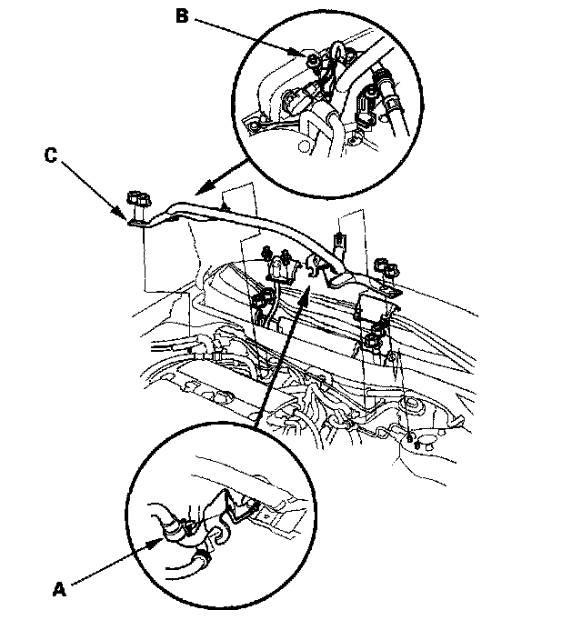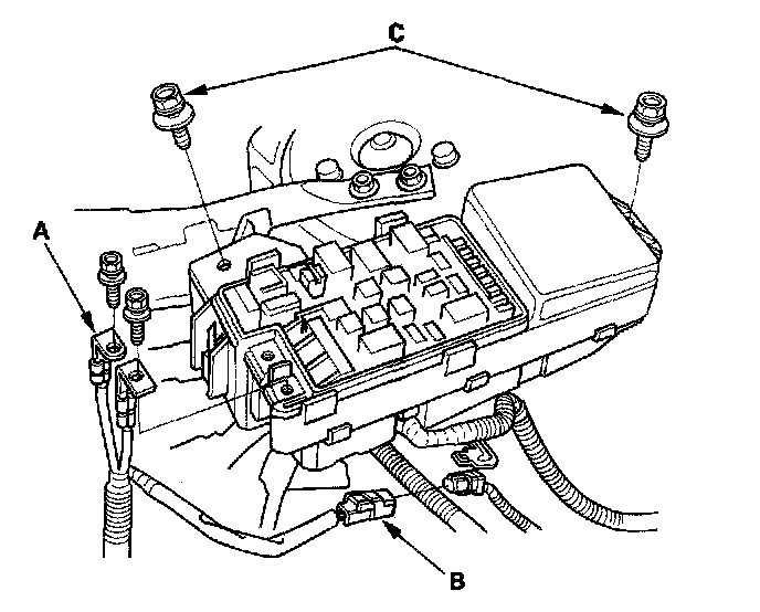 10. Remove the two bolts (C) securing the under-hood fuse/relay box.