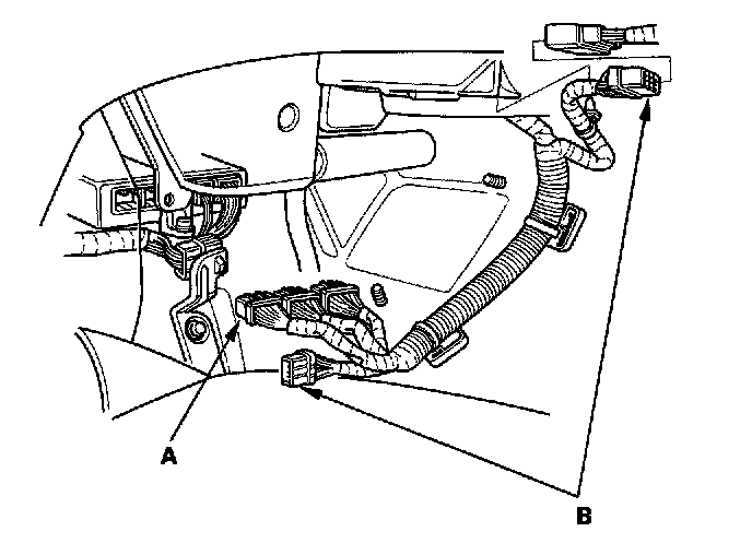 9. Remove the battery cables (A) from the under-hood fuse/relay box, then disconnect the harness connector (B).