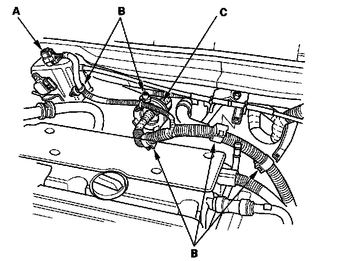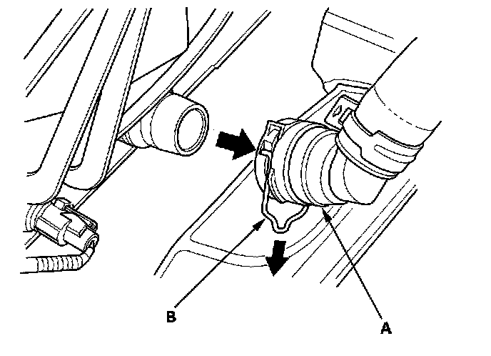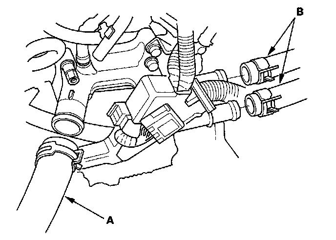 13. Remove the evaporative emission (EVAP) canister hose (A) and brake booster vacuum hose (B).