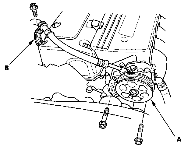 21. Remove the power steering (P/S) pump (A) and the P/S hose clamp (B) without disconnecting the P/S hoses from the pump.