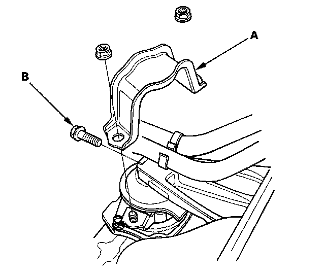47. Remove the rear mount stop (A), then remove the rear mount bolt (B).