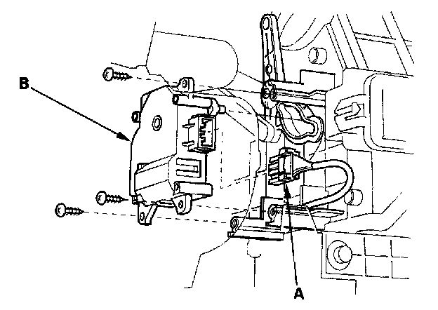3. Disconnect the 7P connector (A) from the recirculation control motor (B). Remove the self-tapping screws and the recirculation control motor from the blower unit.