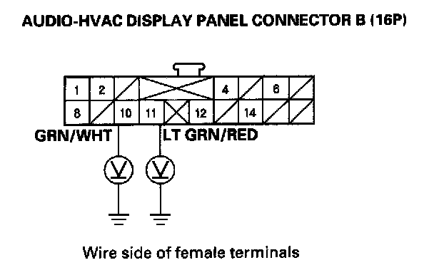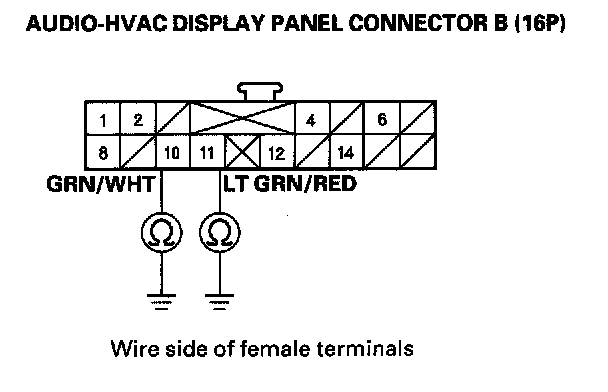 8. Check for continuity between the No. 10 and No. 11 terminals of audio-HVAC display panel connector B (16P) and body ground individually.