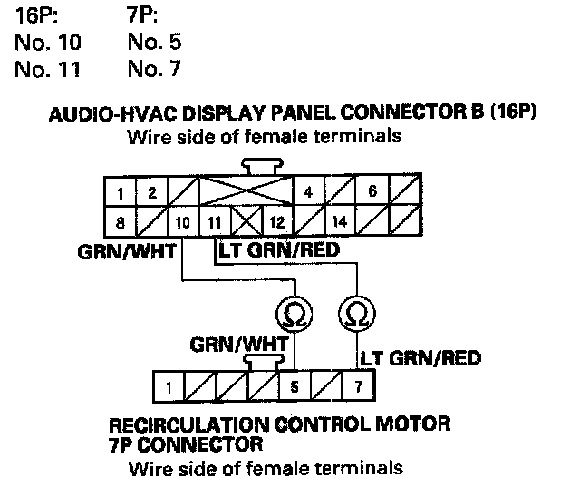 11. Check for continuity between the following terminals of audio-HVAC display panel connector B (16P) and the recirculation control motor 7P connector.