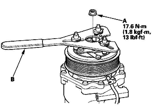 1. Remove the center nut (A) while holding the armature plate with the special tool (B).