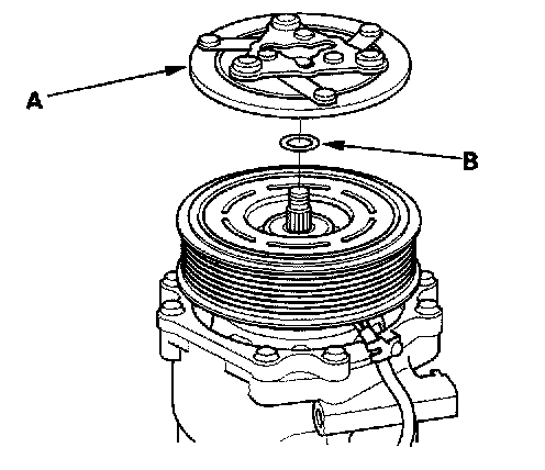 2. Remove the armature plate (A) and shim(s) (B), taking care not to lose the shim(s). If the clutch needs adjustment, increase or decrease the number and thickness of shims as necessary, then reinstall the armature plate, and recheck its clearance.