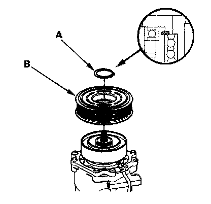 3. If you are replacing the field coil, remove the snap ring (A) with snap ring pliers, then remove the rotor pulley (B). Be careful not to damage the rotor pulley and A/C compressor.