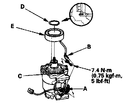4. Remove the bolt and holder (A), then disconnect the field coil connector (B). Loosen the clamp screw (C) to free the field coil wire. Remove the snap ring (D) with snap ring pliers, then remove the field coil (E). Be careful not to damage the field coil and A/C compressor.