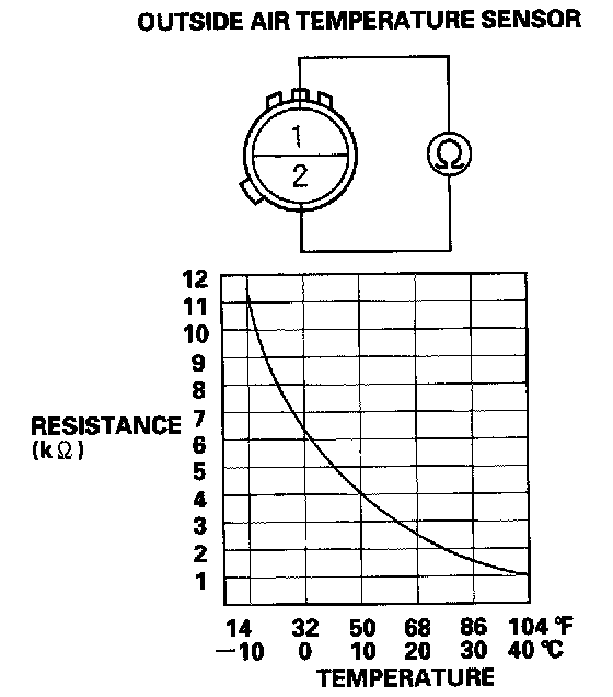 Compare the resistance reading between the No. 1 and No. 2 terminals of the outside air temperature sensor with the specifications shown in the graph; the resistance should be within the specifications.