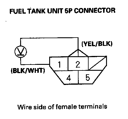 7. Measure voltage between fuel tank unit 5P connector terminals No. 1 and No. 2 with the ignition switch ON (II). There should be battery voltage.