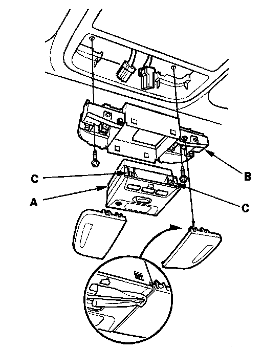 2. Carefully pry off the ambient light assembly (A) from the map light housing (B) while pressing in on the retaining tabs (C).