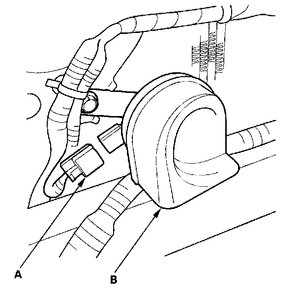 3. Test the horn by connecting battery power to the terminal (A) and grounding the bracket (B). The horn should sound.