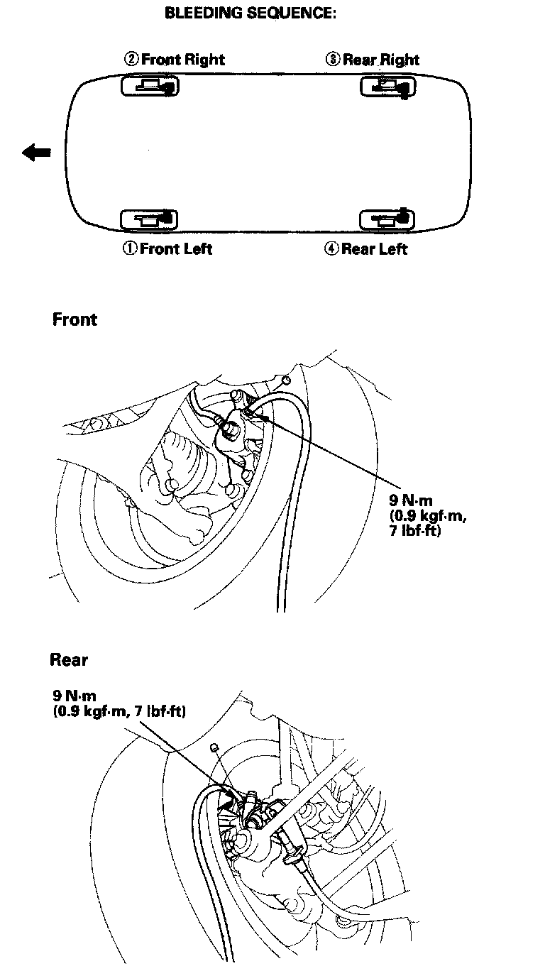 5. Repeat the procedure for each wheel in the sequence shown following until air bubbles no longer appear in the fluid.