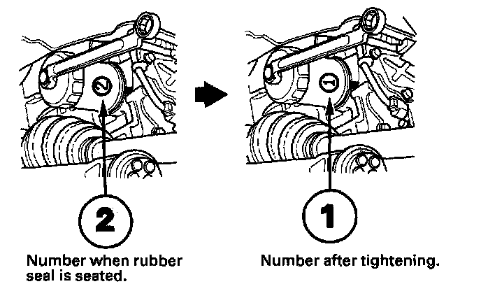 ^ Tighten the filter by turning it clockwise three numbers or marks from the one you noted. For example, if number 2 is at the bottom when the seal is seated, tighten the fitter until the number 1 comes around the bottom.