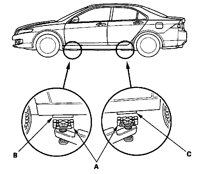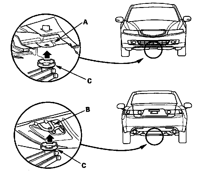 3. Position the floor jack under the front jacking bracket (A) or rear jacking bracket (B), center the jacking bracket in the jack lift platform (C), and jack up the vehicle high enough to fit the safety stands under it.