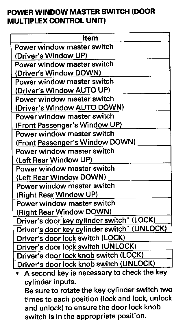 - DTC 3 only (no other DTCs present): Go to the door multiplex control unit input test. Door Multiplex Control Unit Input Test If all inputs are OK, substitute a known-good door multiplex control unit and then a MICU, one at a time, and then check for DTCs. If a DTC recurs after a substitution, replace that unit.