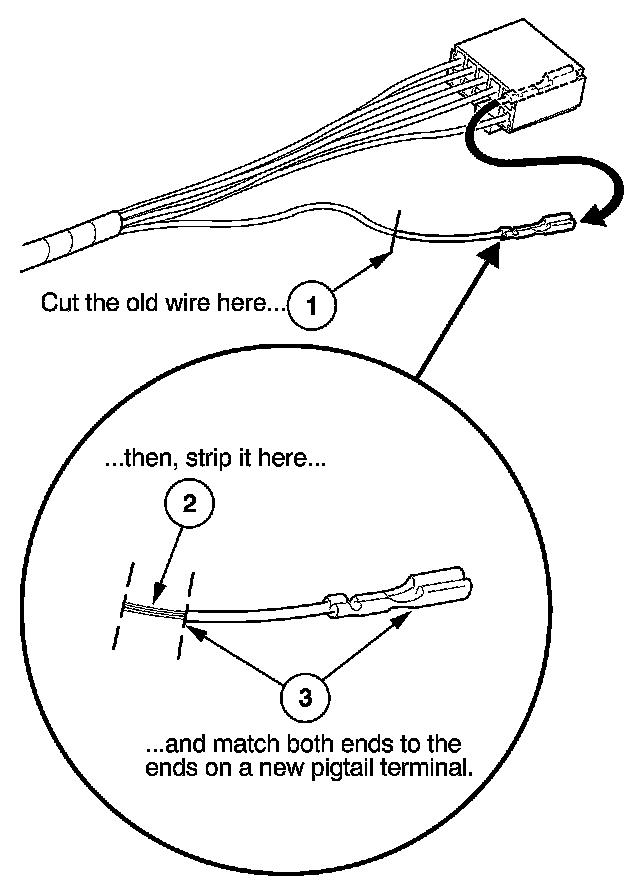 2. Cut off the wire about an inch back from where it connects to the damaged or faulty terminal, then strip about half of the insulation off that piece. This will be used to size the wire end of the replacement pigtail terminal.