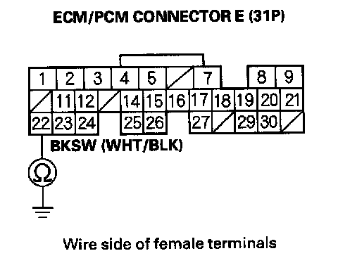 8. Check for continuity between ECM/PCM connector terminal E22 and body ground.