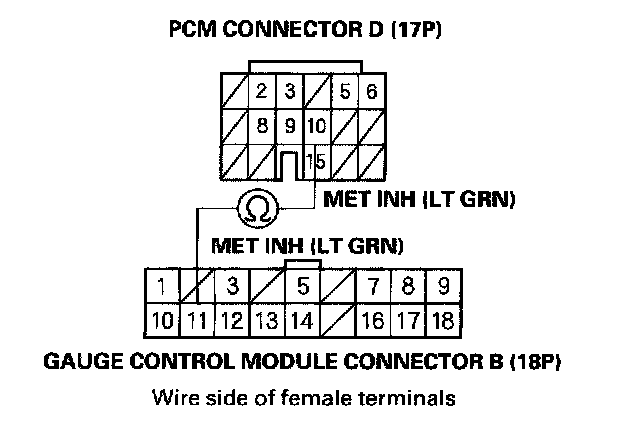 10. Check for continuity between PCM connector terminal D10 and gauge control module connector terminal B11.