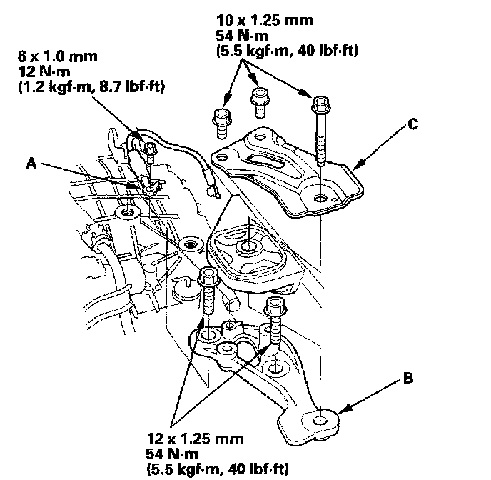 7. Remove the ground cable (A), transmission upper mount bracket (B), and bracket plate (C).