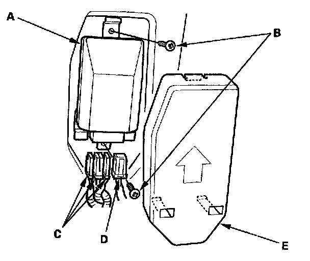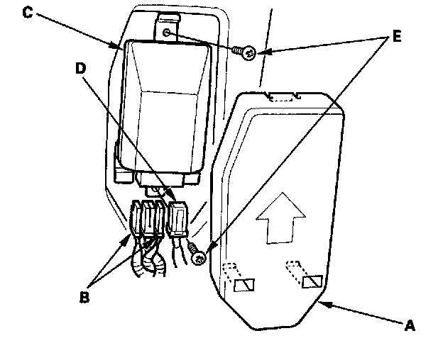 1. Place the new OPDS/ODS unit (A) on the seat-back frame. Tighten the two screws (B), and connect the OPDS unit harness 8P/ODS unit harness 18P connector D and sensor connectors (C) to the OPDS/ODS unit. Reinstall the cover (E).