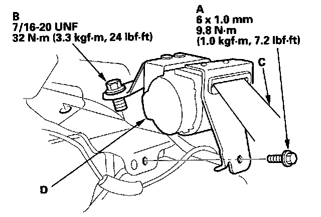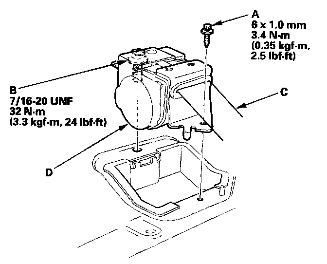 4. Remove the retractor mounting self-tapping ET screw (A) and the retractor bolt (B), then remove the center seat belt (C) and retractor (D).