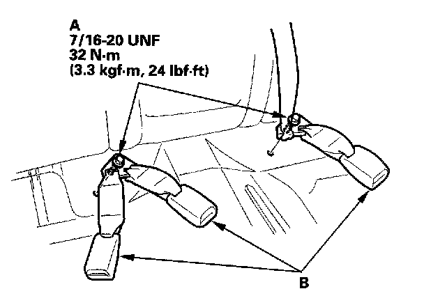 2. Remove the center anchor bolts (A), and remove the seat belt buckles (B).