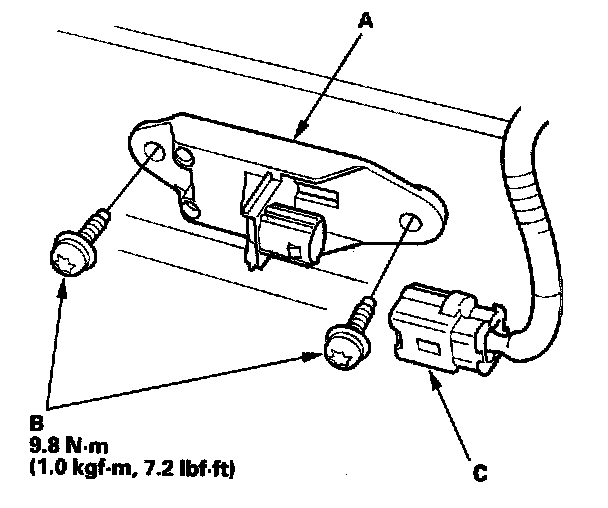 1. Install the new side impact sensor (first) (A) with the Torx bolts (B), then connect the floor wire harness 2P connector (C) to the side impact sensor (first).