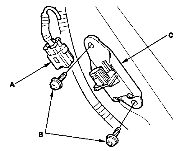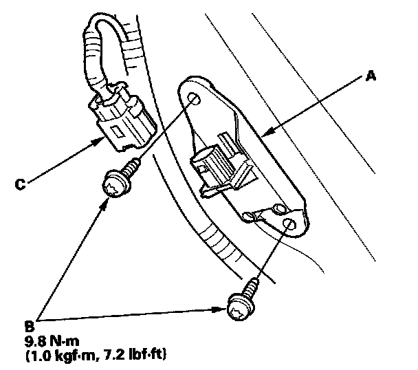 1. Install the new side impact sensor (second) (A) with the Torx bolts (B), then connect the side curtain airbag subharness 2P connector (C) to the side impact sensor (second).