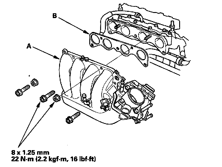 Install the intake manifold (A) with a new gasket (B), and tighten the bolts/nuts in a crisscross pattern in two or three steps, beginning with the inner bolt.