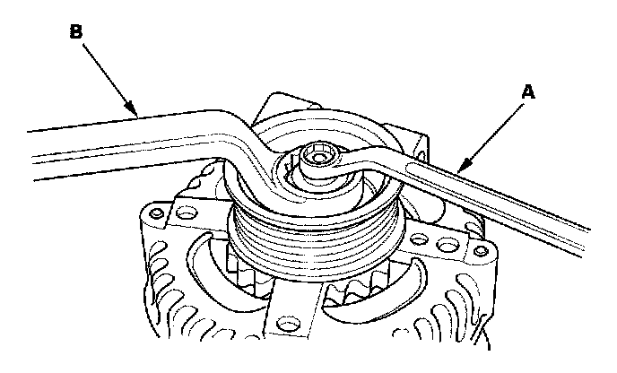 3. If the front bearing needs replacing, remove the pulley locknut with a 10 mm wrench (A) and a 22 mm wrench (B). If necessary, use an impact wrench.