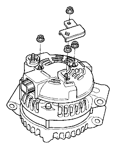 4. Remove the harness stay and the three flange nuts from the alternator.