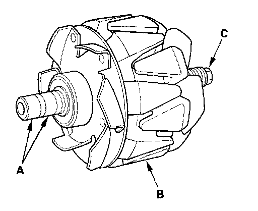 15. Check for continuity between each slip ring and the rotor (B) and the rotor shaft (C).