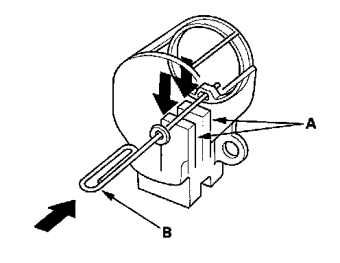 19. Push in the brushes (A), then insert a pin or drill bit (B) (about 1.6 mm (0.06 in.) diameter) to hold them there.