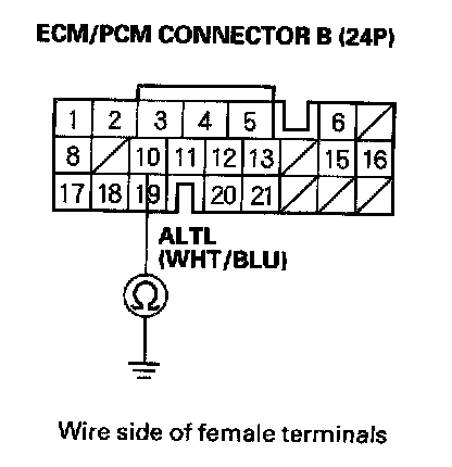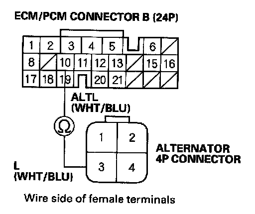 10. Check for continuity between ECM/PCM connector terminal B10 and alternator 4P connector terminal No. 3.