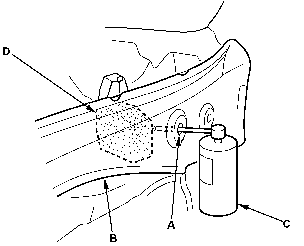 8. Insert the nozzle to the holes (A) of the wheelhouse upper member (B), and spray the anti-rust agent (C) on and around the urethane block (D).