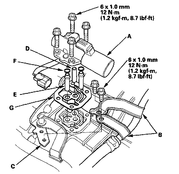 5. Remove the ATF pipe (D), ATF joint pipes (E), O-rings (F), and gasket (G).