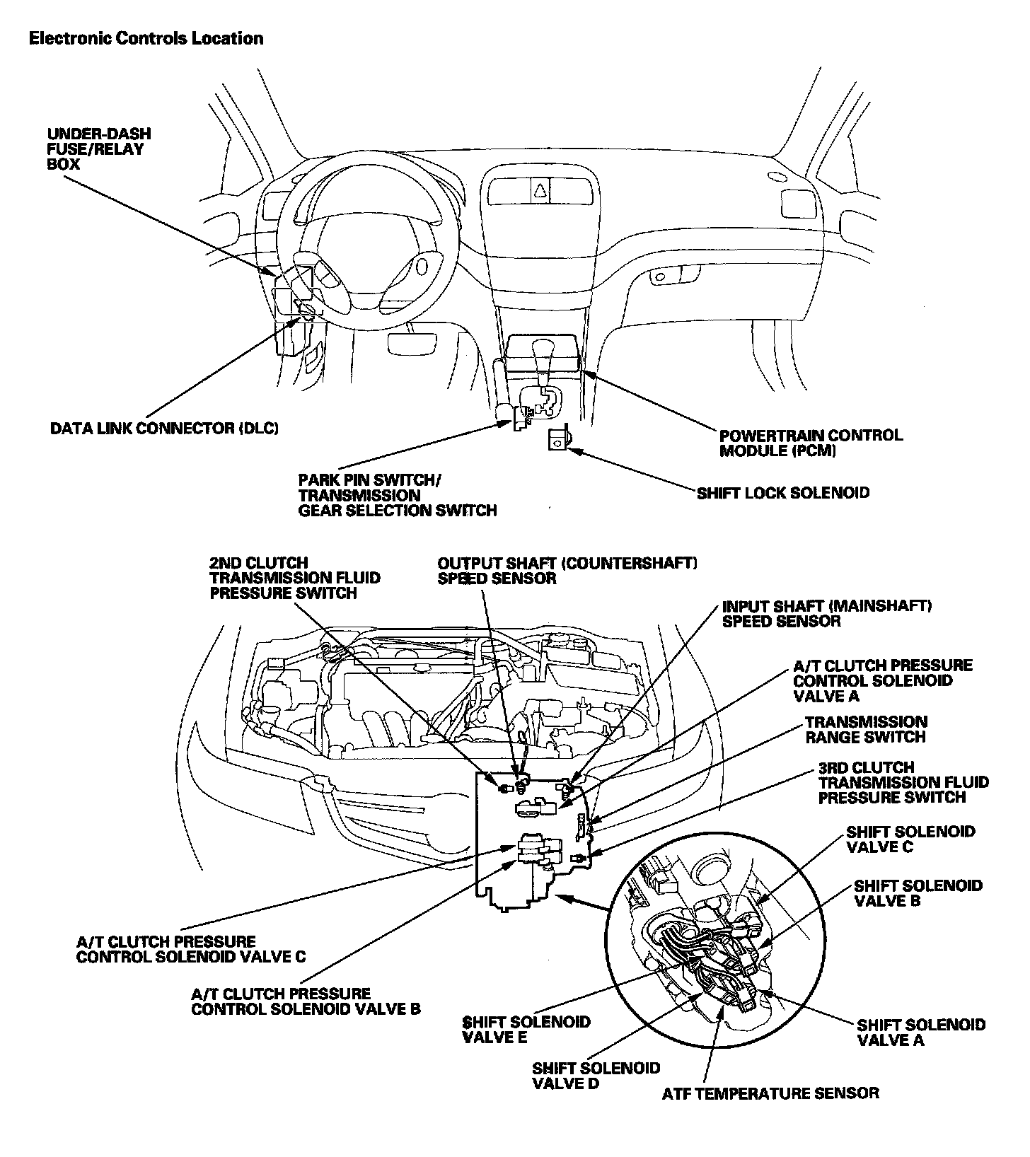 The electronic control system consists of the powertrain control module (PCM), sensors, and solenoid valves. Shifting and lock-up are electronically controlled for comfortable driving under all conditions.