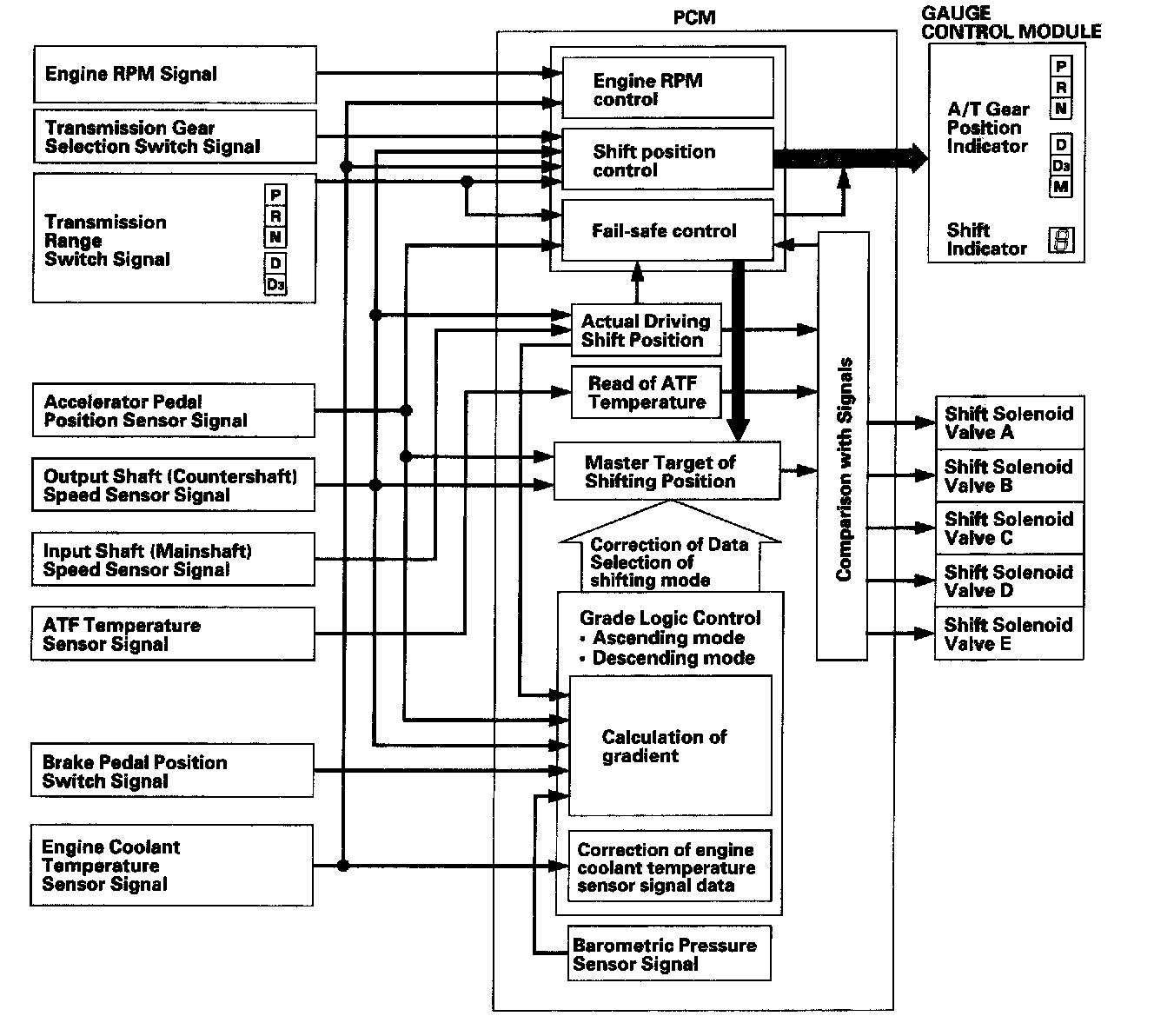 A grade logic control system has been adopted to control shifting in D and D3 positions. The PCM compares actual driving conditions with programmed driving conditions, based on the input from the accelerator pedal position sensor, the engine coolant temperature sensor, the barometric pressure sensor, the brake pedal position switch signal, and the shift lever position signal, to control shifting while the vehicle is ascending or descending a slope.