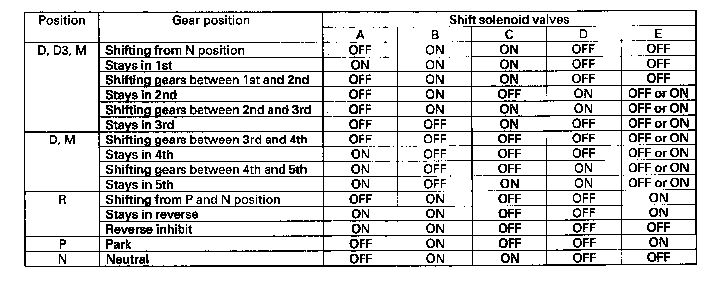 The PCM turns the shift solenoid valves A, B, C, D, and E ON and OFF to control shifting transmission gear. The combination of driving signals to shift solenoid valves A, B, C, D, and E are shown in table.
