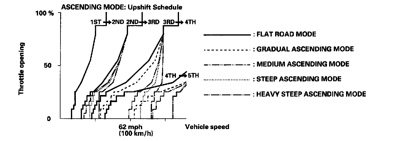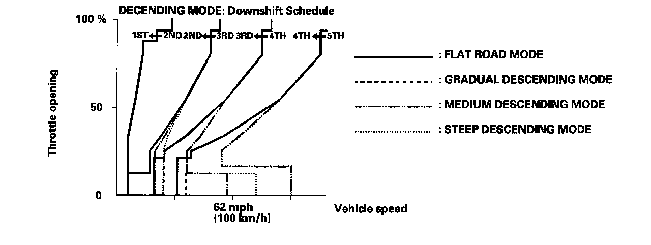 When the PCM determines that the vehicle is going down a hill in D and D3 positions, the shift-up speed from 4th to 5th gear, from 3rd to 4th gear, and from 2nd to 3rd gear (when the throttle is closed) becomes faster than the set speed for flat road driving to widen the 4th gear, 3rd gear, and 2nd gear driving area. This, in combination with engine braking from the deceleration lock-up, achieves smooth driving when the vehicle is descending. There are three descending modes with different 4th gear driving areas, 3rd gear driving areas, and 2nd gear driving areas according to the magnitude of a gradient stored in the PCM. When the vehicle is in 5th gear or 4th gear, and you are decelerating when you are applying the brakes on a steep hill, the transmission will downshift to lower gear. When you accelerate, the transmission will then return to a higher gear.