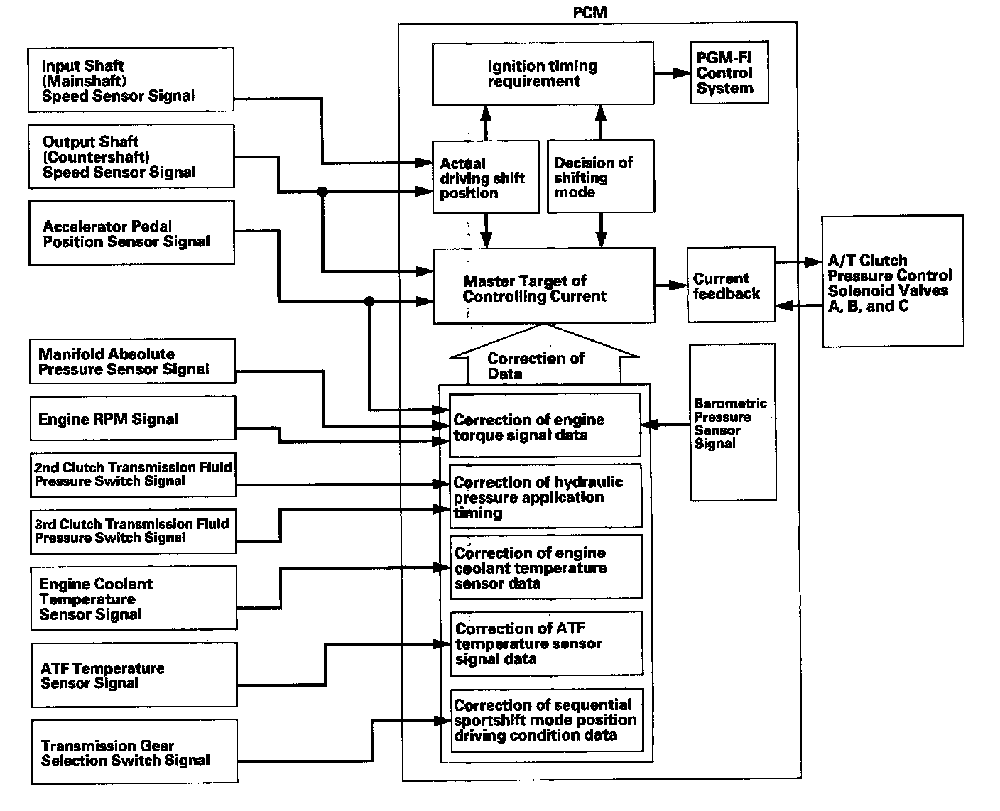 The PCM receives input signals from the various sensors and switches, processes data, and outputs a current to A/T clutch pressure control solenoid valves A, B, and C.