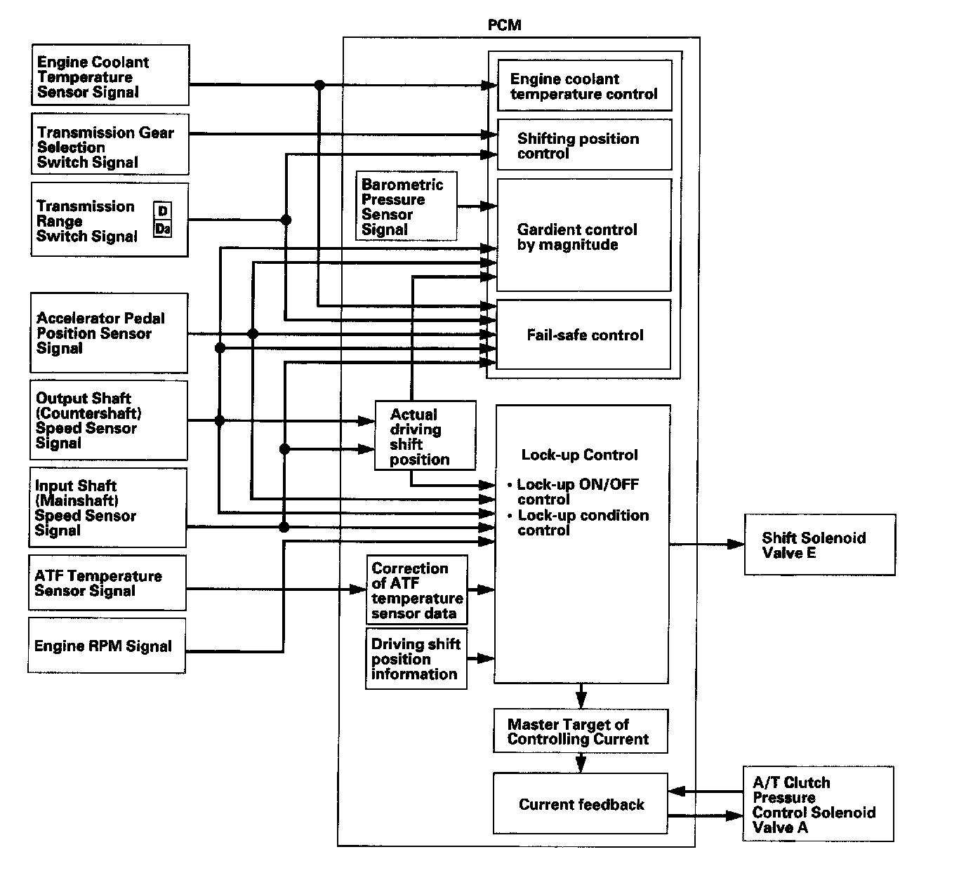 The PCM receives input signals from the sensors, switches, and other control units, processes data, and outputs signals for the engine control system and A/T control system. The A/T control system includes shift control, grade logic control, clutch pressure control, and lock-up control. The PCM activates the shift solenoid valves and the A/T clutch pressure control solenoid valves to control shifting transmission gears and lock-up torque converter clutch.