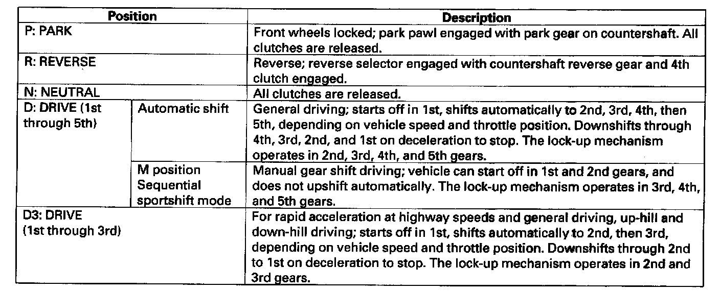 The shift lever has five positions: P: PARK, R: REVERSE, N: NEUTRAL, D: DRIVE 1st through 5th gear range with automatic shift and sequential sportshift in M (sequential sportshift mode) position, and D3: DRIVE 1st through 3rd gear range with automatic shift.