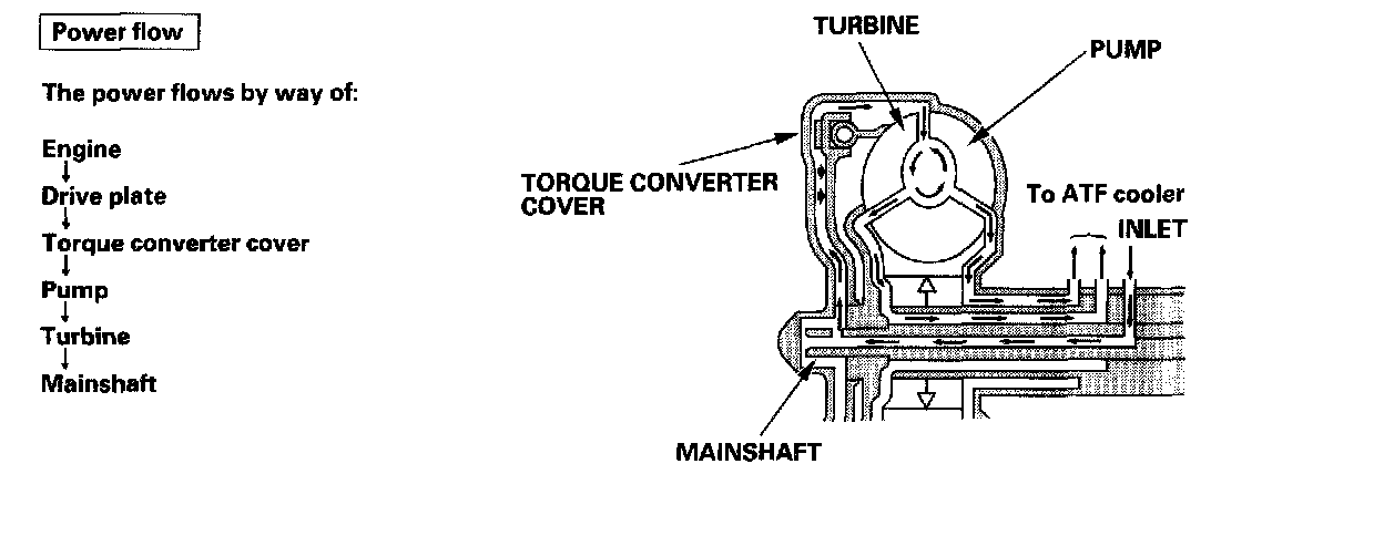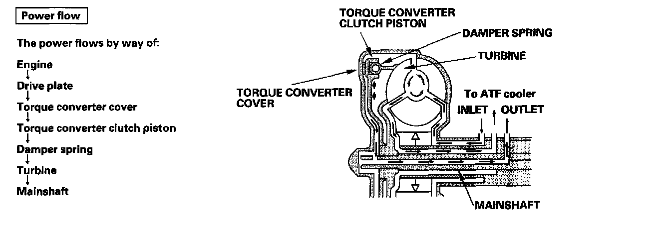 Fluid entering from the chamber between the torque converter cover and the torque converter clutch piston passes through the torque converter and goes out through the chambers between the turbine and the stator, and between the pump and the stator. As a result, the torque converter clutch piston moves away from the torque converter, and the torque converter lock-up clutch is released; torque converter clutch lock-up is OFF.