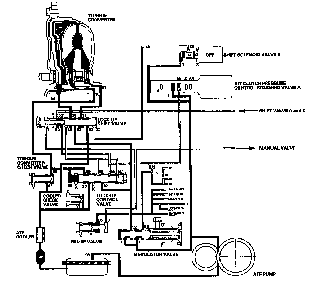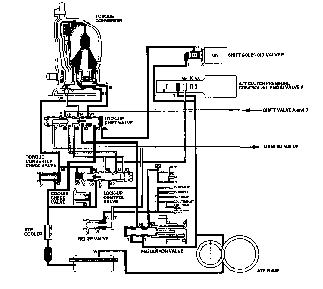 Shift solenoid valve E is turned OFF by the PCM, and shift solenoid valve E pressure (SE) is not applied to the lock-up shift valve. The lock-up shift valve stays to the right to uncover the torque converter pressure ports leading to the left side of the torque converter and releasing pressure from the right side of the torque converter. Torque converter pressure (92) changes to (94) at the lock-up shift valve, and enters into the left side of the torque converter to disengage the torque converter clutch. This keeps the torque converter clutch piston keeps away from the torque converter cover and the torque converter lock-up clutch is OFF.