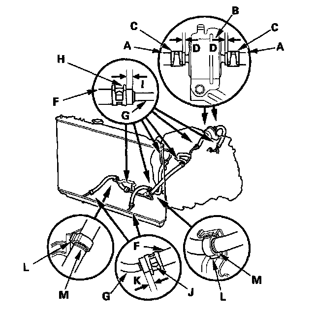 3. Slide the ATF cooler hoses (F) over the ATF cooler lines (G).