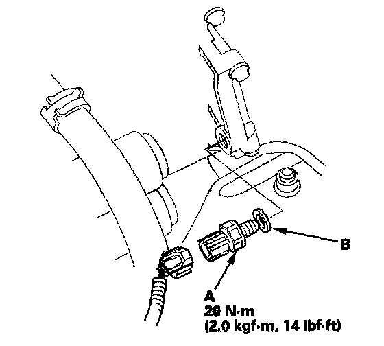 7. Install the 3rd clutch new transmission fluid pressure switch with a new sealing washer (B), and tighten the switch to the specified torque.
