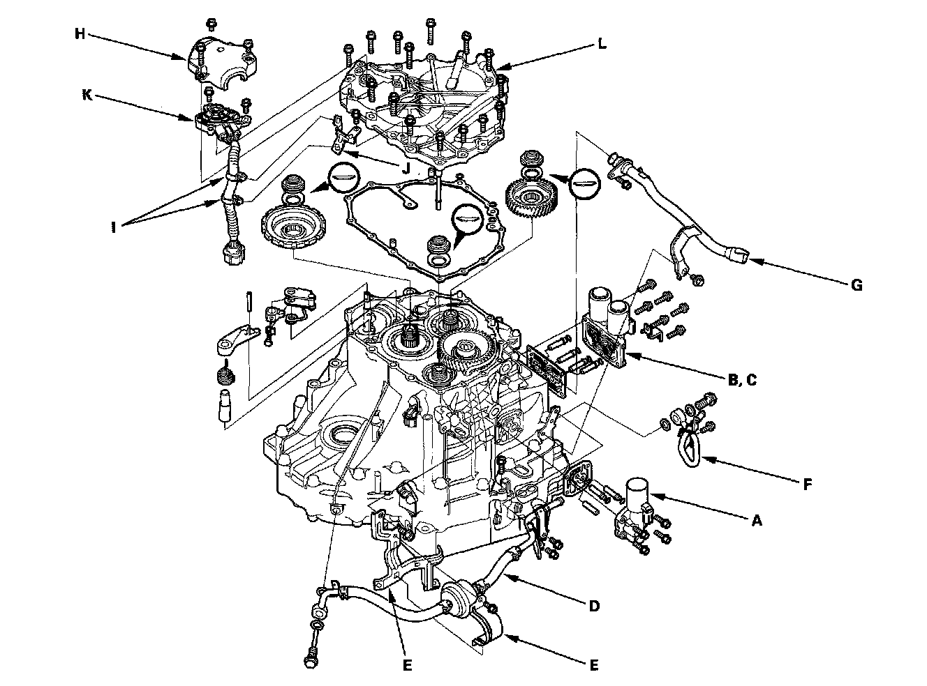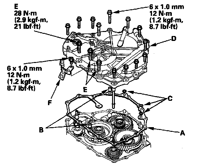 NOTE: Replace the end cover, if the 1st clutch ATF feed pipe (E) replacement is required.