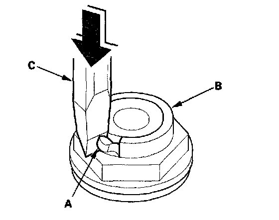 11. Cut the lock tab (A) of the each shaft locknut (B) using a chisel (C). Then remove the locknuts and conical spring washers from each shaft.